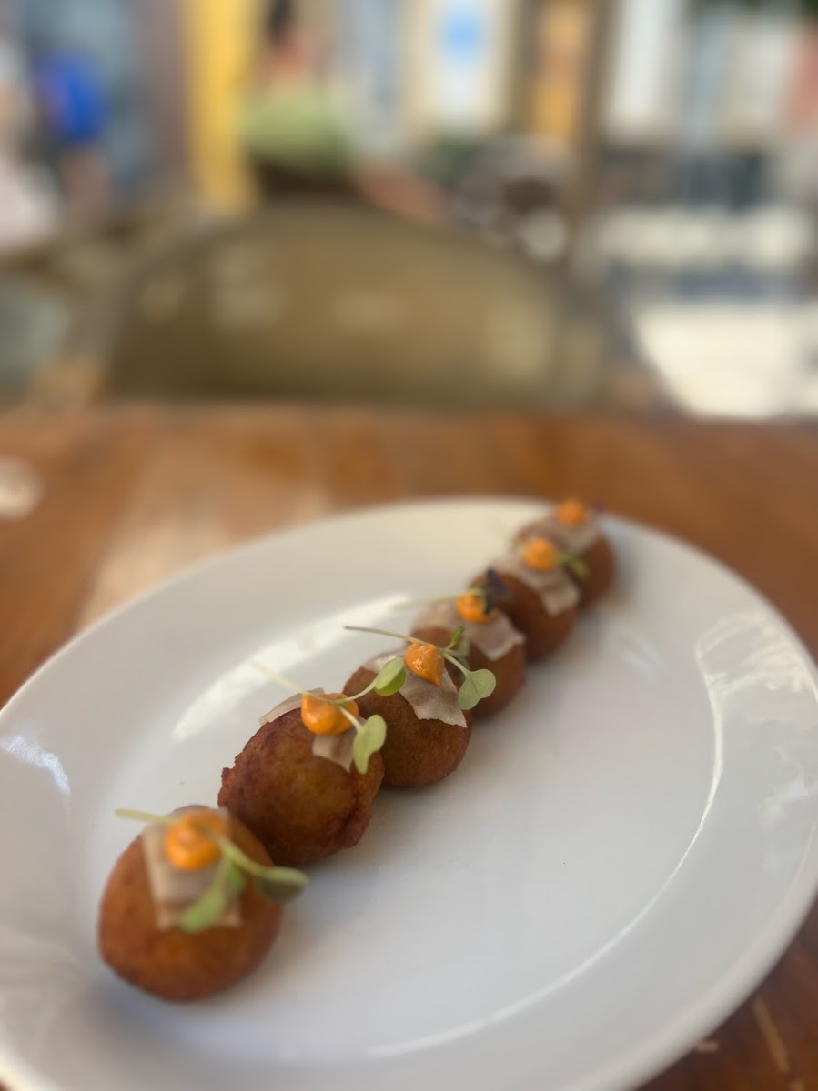 We spent lovely time enjoying exquisite wine and extraordinary food. My husband enjoyed the almond soup for starter, I had very tasty croquettes. We both had a red snapper for main course and it was delicious! Beautifully balanced and perfectly cooked fish. If you in Seville, this place is the best to visit!